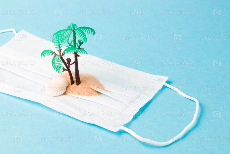 Пальма, песок и ракушка на защитной маске для лица, пространство для копирования синего фона, концепция путешествий и карантина, запрет на полеты во время пандемии, перенос праздников