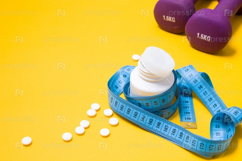 Синяя измерительная лента вокруг белой банки с таблетками, таблетки разбросаны на желтом фоне, на заднем плане - гантели фиолетового цвета, пространство для копирования, концепция похудения