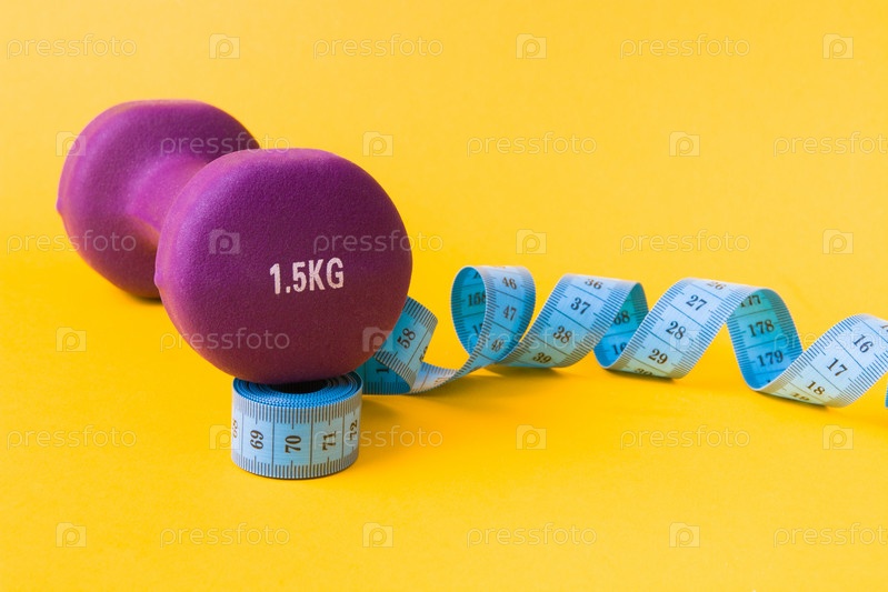 1,5-килограммовая фиолетовая гантель и синяя измерительная лента на желтом фоне, гантель основана на свернутой ленте, копировальном пространстве, концепции потери веса
