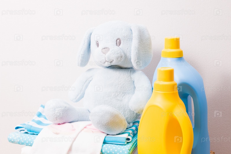 Гель для стирки и кондиционер для белья в ярких пластиковых бутылках желтого и синего цветов, стопка цветной детской одежды и игрушка, прищепки для сушки на ярком фоне