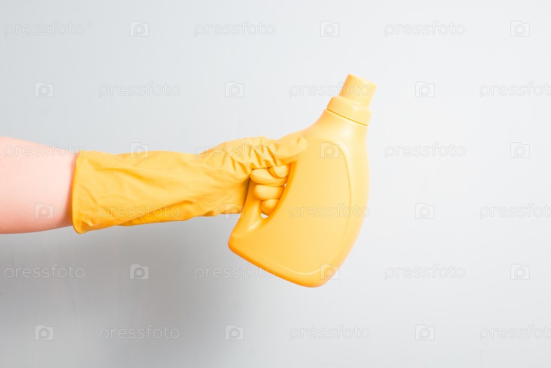 Женская рука в желтой резиновой перчатке держит желтую бутылку геля для стирки без этикетки на голубом фоне, пространство для копирования
