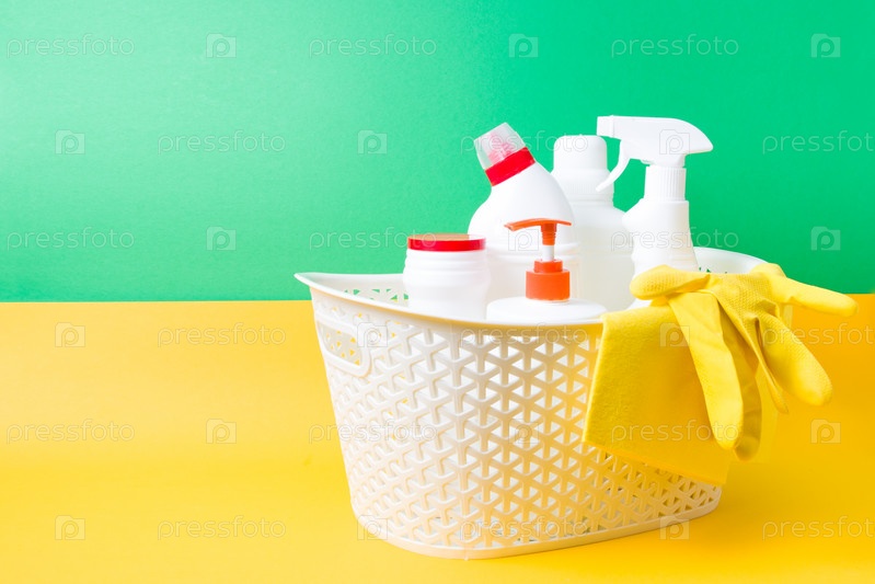 Желтые многоразовые резиновые перчатки, желтая тряпка для уборки и разные белые пластиковые бутылки с моющими средствами для дома в пластиковой корзине на желто-зеленом фоне, концепция набора для уборки