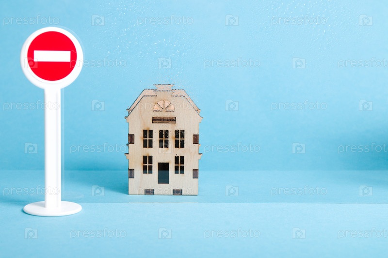 Деревянная модель домаза с мокрым стеклом, красный знак остановки рядом, синий фон, место для копирования, концепция карантина, защита дома, страхование недвижимости