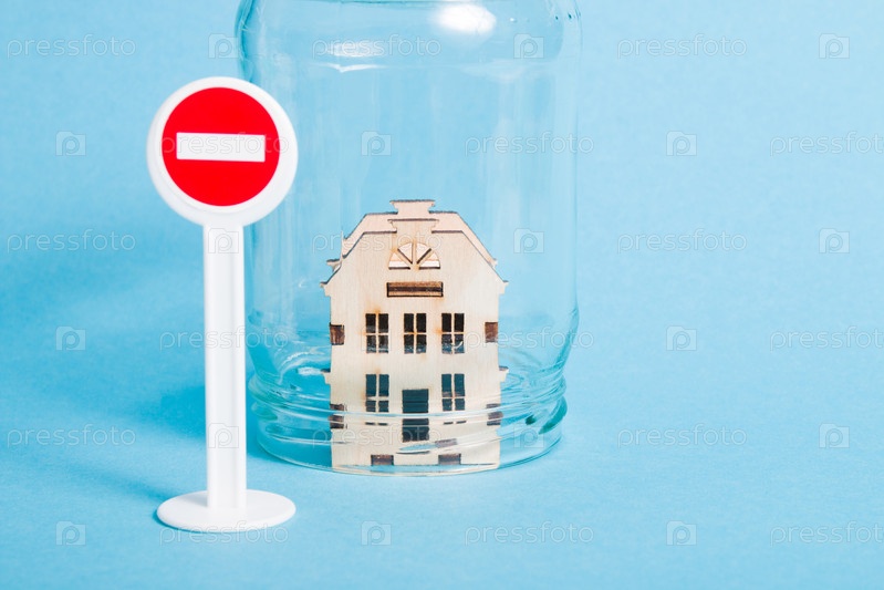 Модель деревянного дома под стеклянной банкой, красный знак остановки рядом, синий фон, пространство для копирования, концепция карантина, защита дома, страхование недвижимости