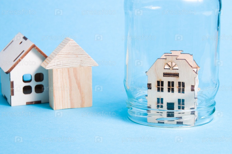 Модель голландского дома под стеклянной банкой, на фоне деревянных игрушечных домиков, синий фон, пространство для копирования, концепция карантина, защита дома, страхование недвижимости
