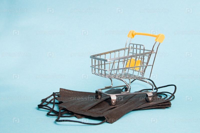 Миниатюрная продуктовая корзина стоит на черных защитных медицинских масках, синий фон, пространство для копирования, покупка масок для защиты от коронавируса, концепция карантина