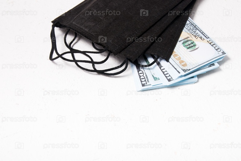 Черные медицинские защитные маски и стопка 100-долларовых купюр на белом фоне, пространство для копирования, кризис 2020, концепция коронавируса, карантин 2020