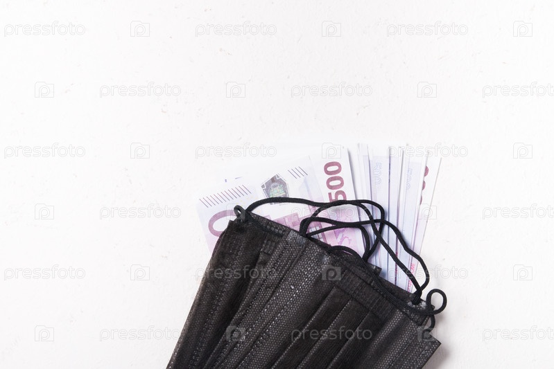 Черные медицинские маски для защиты от коронавируса и стопка банкнот на 500 евро, белый фон, пространство для копирования, купить маску, карантин 2020, концепция мирового кризиса