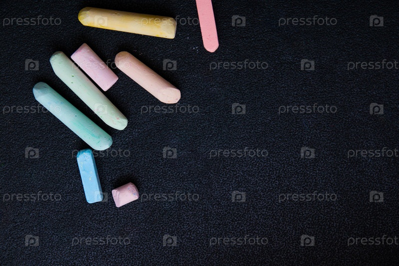 Цветные мелки на черном фоне, пространство для копирования, контраст ярких цветов, вид сверху