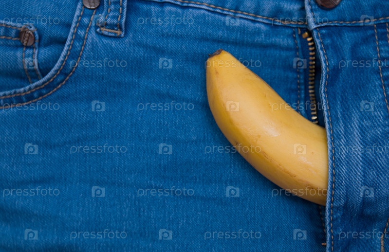 Желтый банан торчит из молнии синие брюки джинсы вид сверху