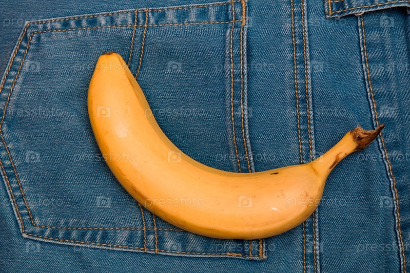 Банан лежит на заднем кармане синих джинсовых брюк желтый вид сверху