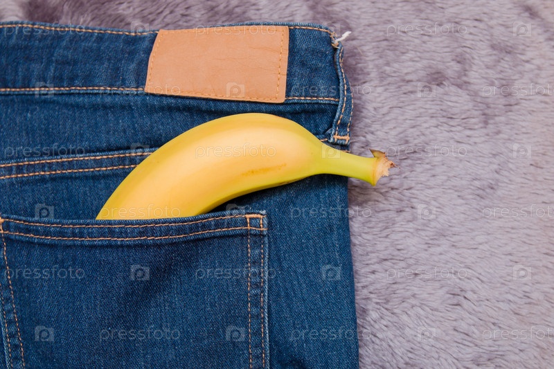 Банан в заднем кармане синих джинсов вид сверху желто-серый фон