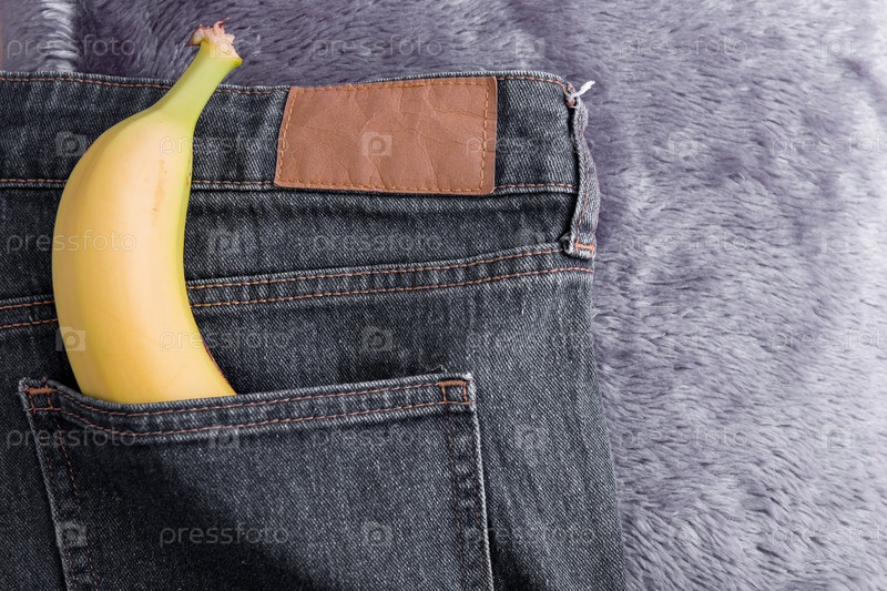 Банан в заднем кармане серых джинсов вид сверху желтый мех фон