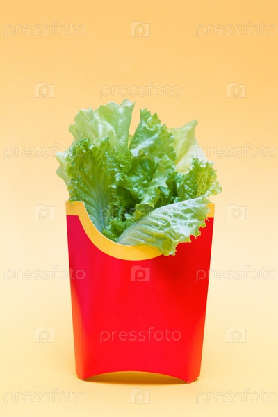 Свежие сырые зеленые листья салата в упаковке из красного картофеля фри на желтом фоне копией пространства, один лист лежит рядом, правильное питание, концепция здорового образа жизни, замена нездоровой пищи, отсутствие вредных продуктов