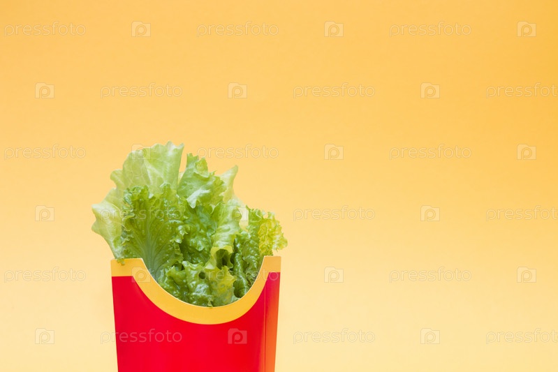 Свежие сырые зеленые листья салата в упаковке из красного картофеля фри на желтом фоне копией пространства, один лист лежит рядом, правильное питание, концепция здорового образа жизни, замена нездоровой пищи, отсутствие вредных продуктов