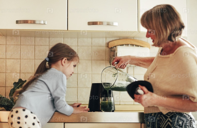 Любящая бабушка готовит вместе с внучкой дома, используя блендер для смешивания овощей