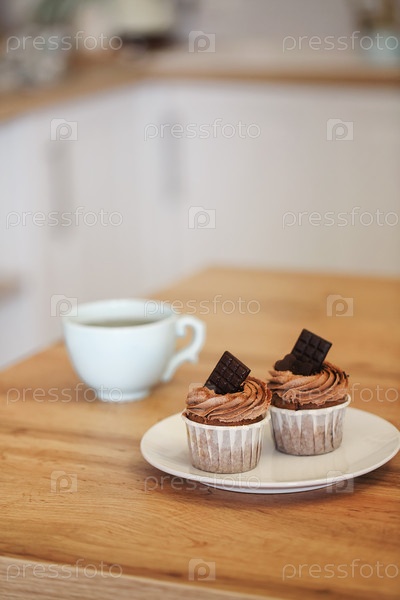 Два кекса на белой тарелке, украшенные какао-кремом и кусочками шоколада с чашкой чая
