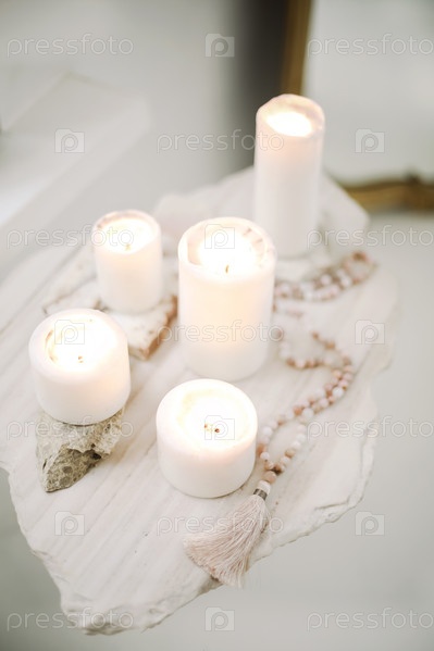Горящие свечи разных размеров и молитвенные четки на подставке из камня и бетона