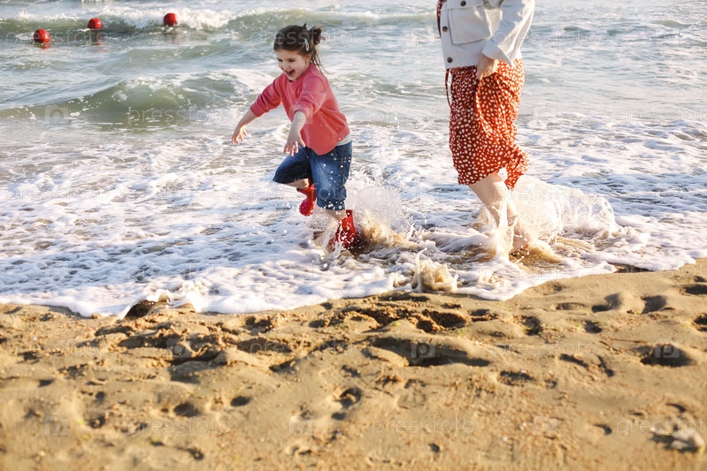 Молодая любящая мать с улыбающейся дочерью, бегущей по солнечному пляжу