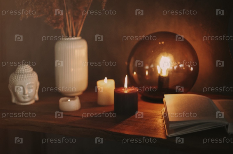 Круглое зеркало на деревянной полке с двумя горящими свечами и маленькой фарфоровой головой Будды