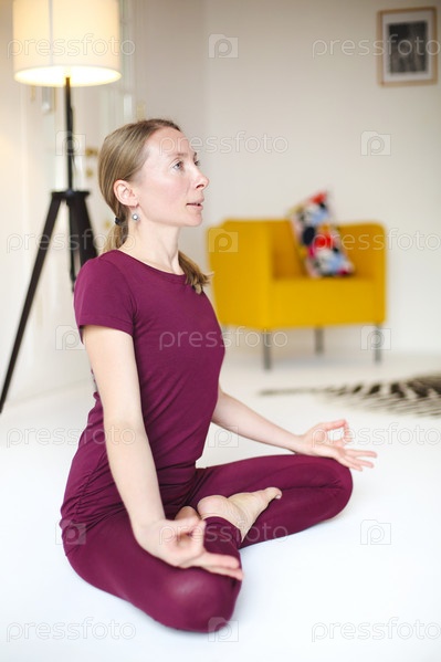 Стройная женщина медитирует в позе лотоса