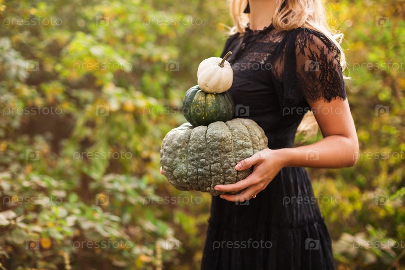 Крупный план красивой молодой блондинки с длинными прямыми волосами, в черном гипюровом платье, с тыквами в руках