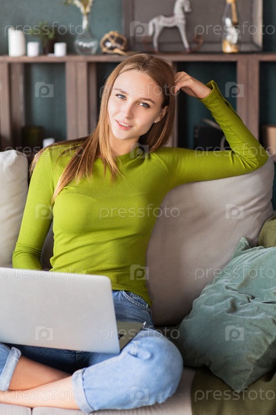 Веселая блондинка-фрилансер в джинсах и зеленой рубашке с ноутбуком на скрещенных ногах