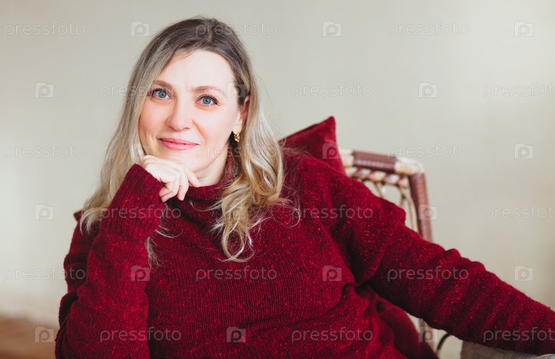 Привлекательная счастливая женщина средних лет сидит и отдыхает на удобном стуле дома