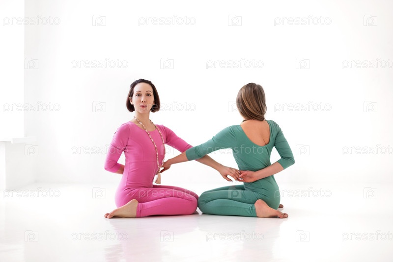 Две молодые женщины занимаются йогой в помещении, сидя в положении изолированы на белом фоне студии