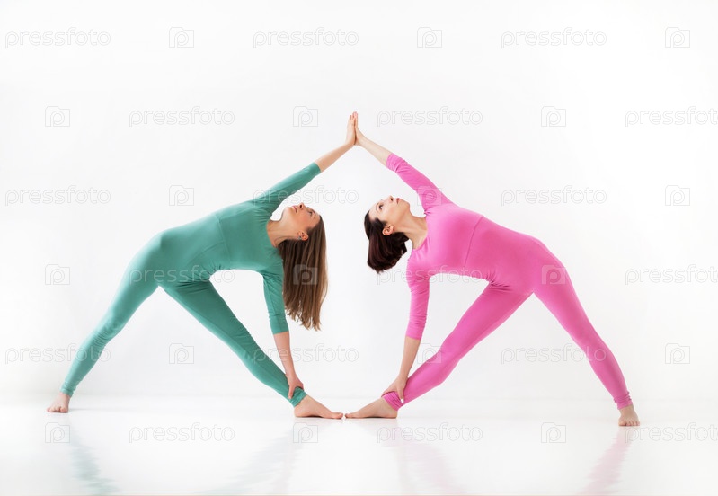 Две молодые женщины занимаются йогой в помещении, стоя в положении изолированы на белом фоне студии