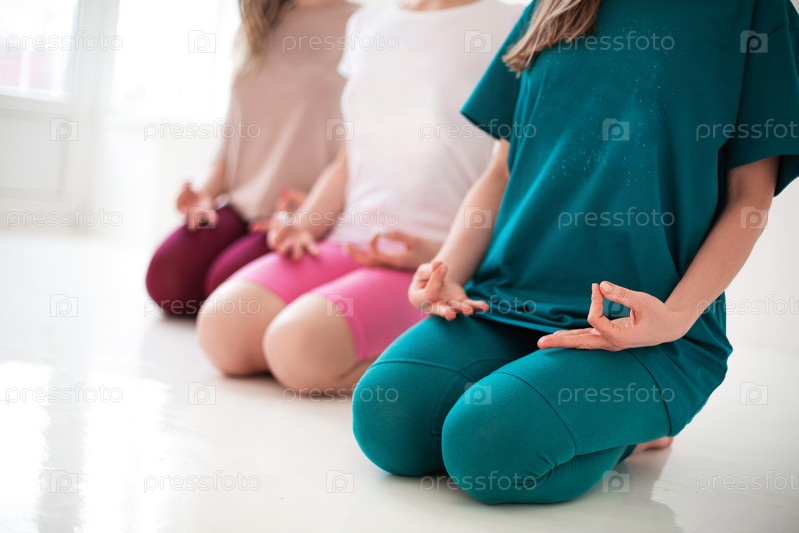 Молодые счастливые здоровые женщины в длинных спортивных костюмах вместе выполняют асаны йоги