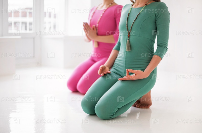 Две молодые счастливые здоровые женщины в длинных спортивных костюмах вместе выполняют асаны йоги