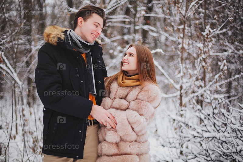 Красивая молодая пара подростков проводит время вместе на улице холодной зимой