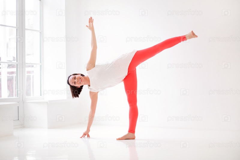 Молодая стройная женщина в спортивной одежде, выполняющая позу йоги, изолированная на белом фоне студии