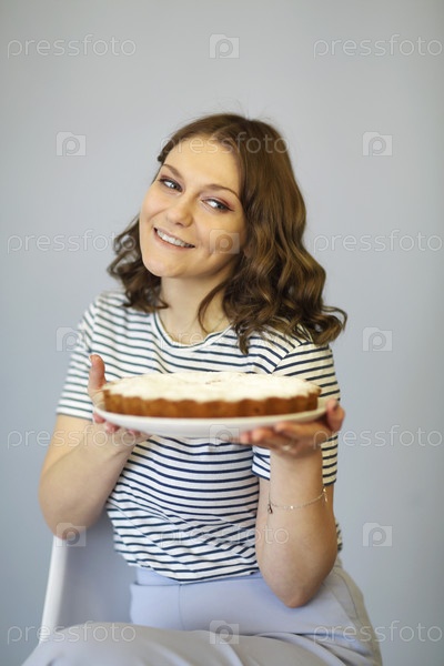 Молодая счастливая брюнетка с макияжем кошачьих глаз сидит боком, держа руками свежеиспеченный яблочный пирог