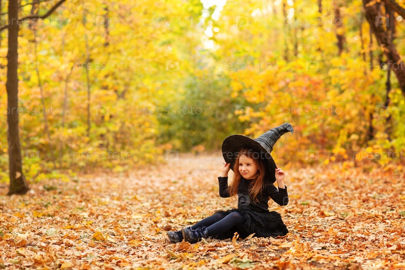 Портрет милой маленькой девочки, одетой в костюм ведьмы, сидящей на опавших листьях в осеннем лесу