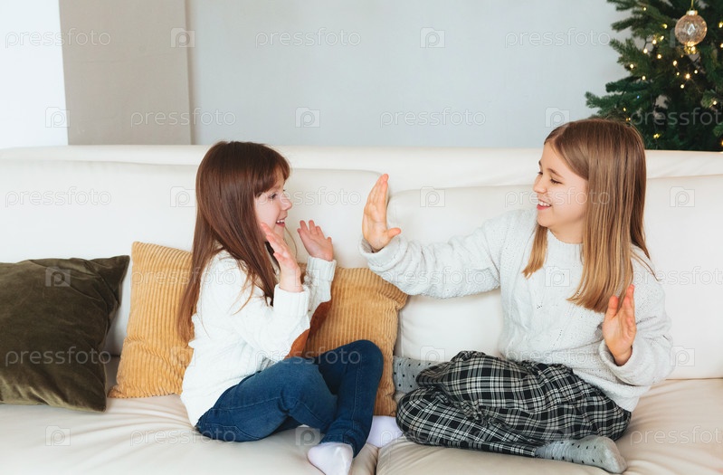 Две веселые улыбающиеся девочки-сестры сидят на диване в гостиной и играют в пирожные