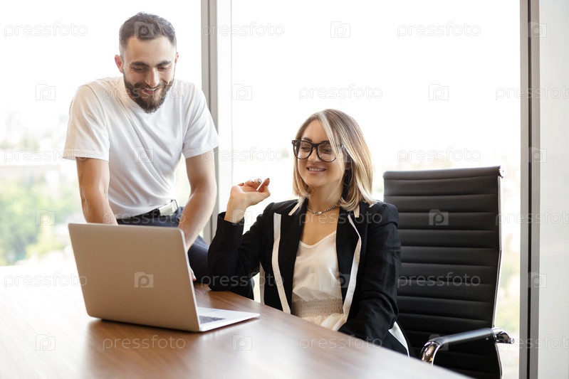 Позитивная деловая женщина смотрит на экран ноутбука, сидя за столом, обучая нового сотрудника-мужчину