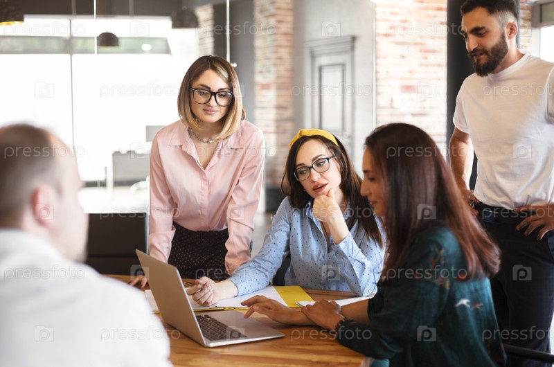 Разнообразные коллеги собираются в офисе, чтобы вместе обсудить финансовую статистику, глядя в ноутбук