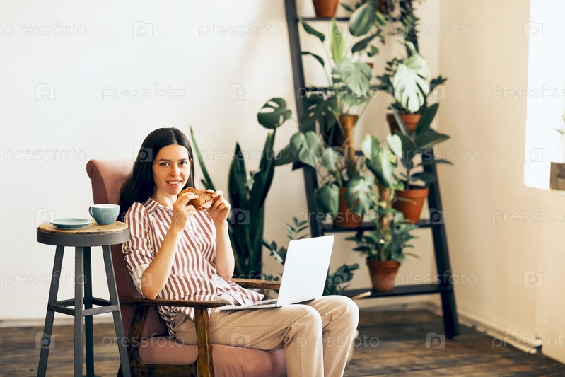 Женщина-фрилансер пьет кофе во время работы