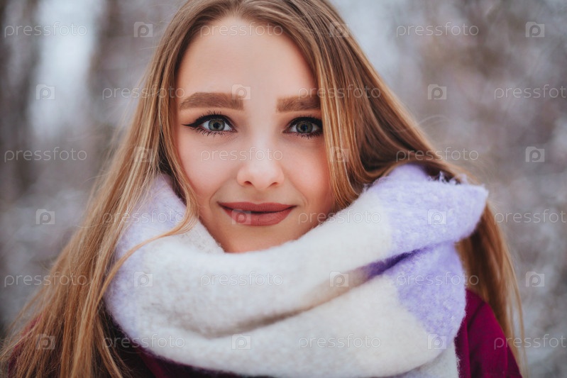 Лицо молодой женщины покрыто светлым вязаным шарфом