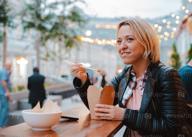 Европейская блондинка ест рис Фо Бо с деревянными палочками за столом уличного вьетнамского кафе в Москве