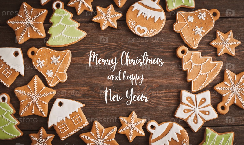 Праздничные рождественские пряники в форме звезды лежат на деревянном темно-коричневом фоне