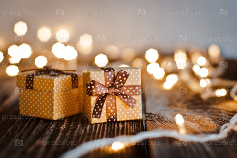 Рождественская подарочная коробка лежала на деревянном столе на фоне боке праздничных огней