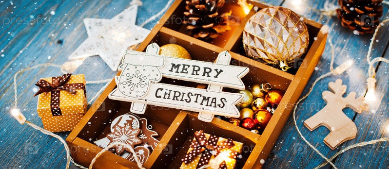 Новогоднее украшение и фон для поздравлений со свободным местом для текста. Рождественские украшения находятся в коробке на синем деревянном фоне. деревенский