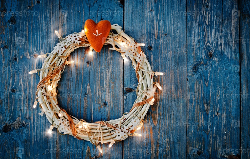 Новогодние украшения вокруг рождественского письма пустое место для текста горящие огни гирлянды на синем деревянном фоне