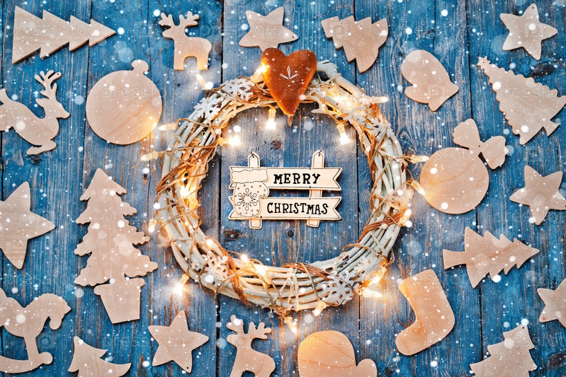 Новогодние украшения вокруг рождественского письма пустое место для текста горящие огни гирлянды на синем деревянном фоне