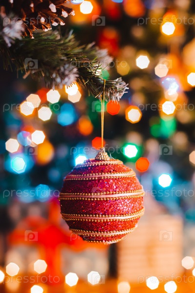 Рождественский бал висит на украшенной елке на фоне горящих огней боке ночью