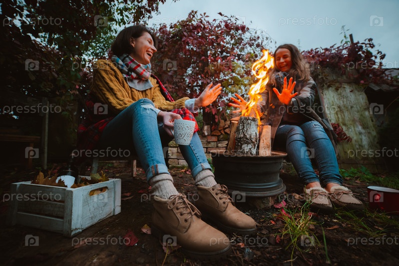 Трое друзей уютно отдыхают и пьют вино осенним вечером на свежем воздухе у костра на заднем дворе