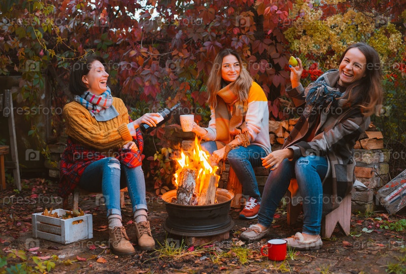 Трое счастливых радостных лучших друзей сидят в осеннем саду у костра с бутылкой красного вина